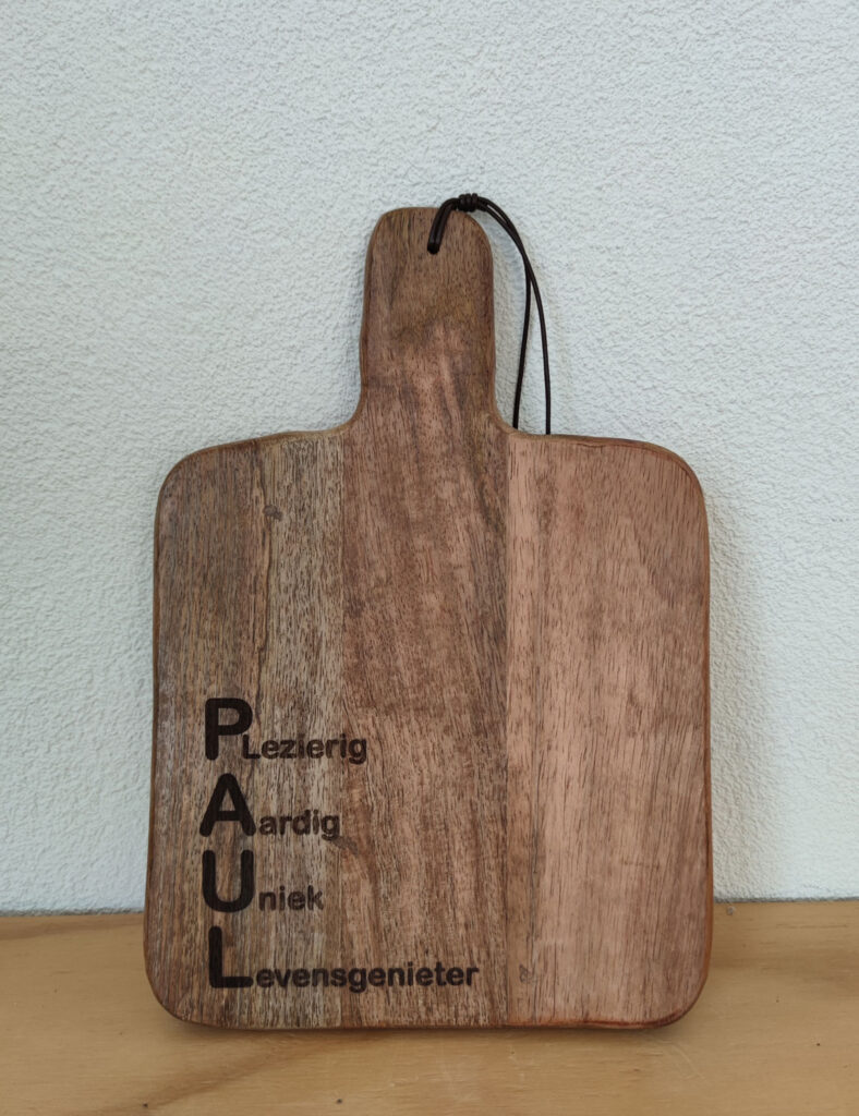 Een gezellige borrel begint met een prachtige borrelplank met naam of tekst. Onze houten borrelplanken worden met zorg gegraveerd. Voeg een naam, trouwdatum of leuke tekst toe en creëer een blijvende herinnering. Ideaal als huwelijkscadeau of voor een housewarming.