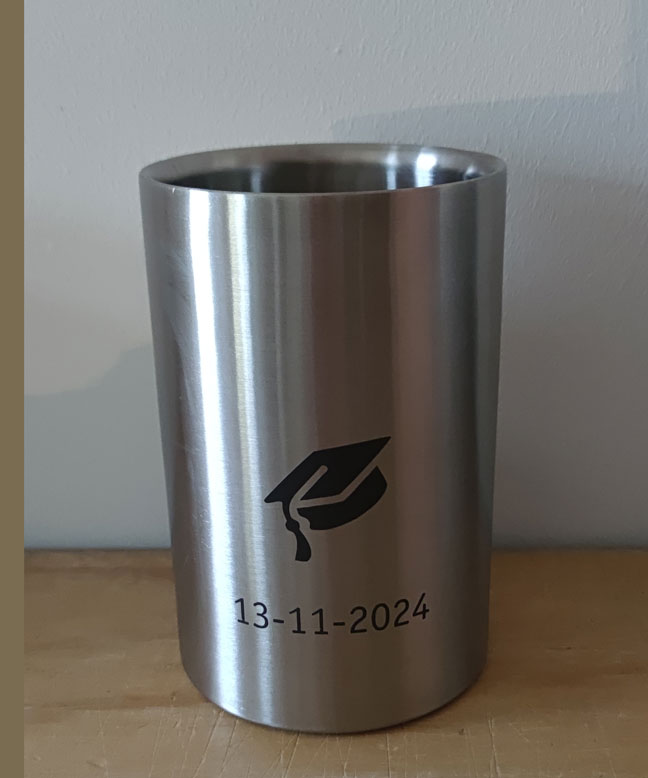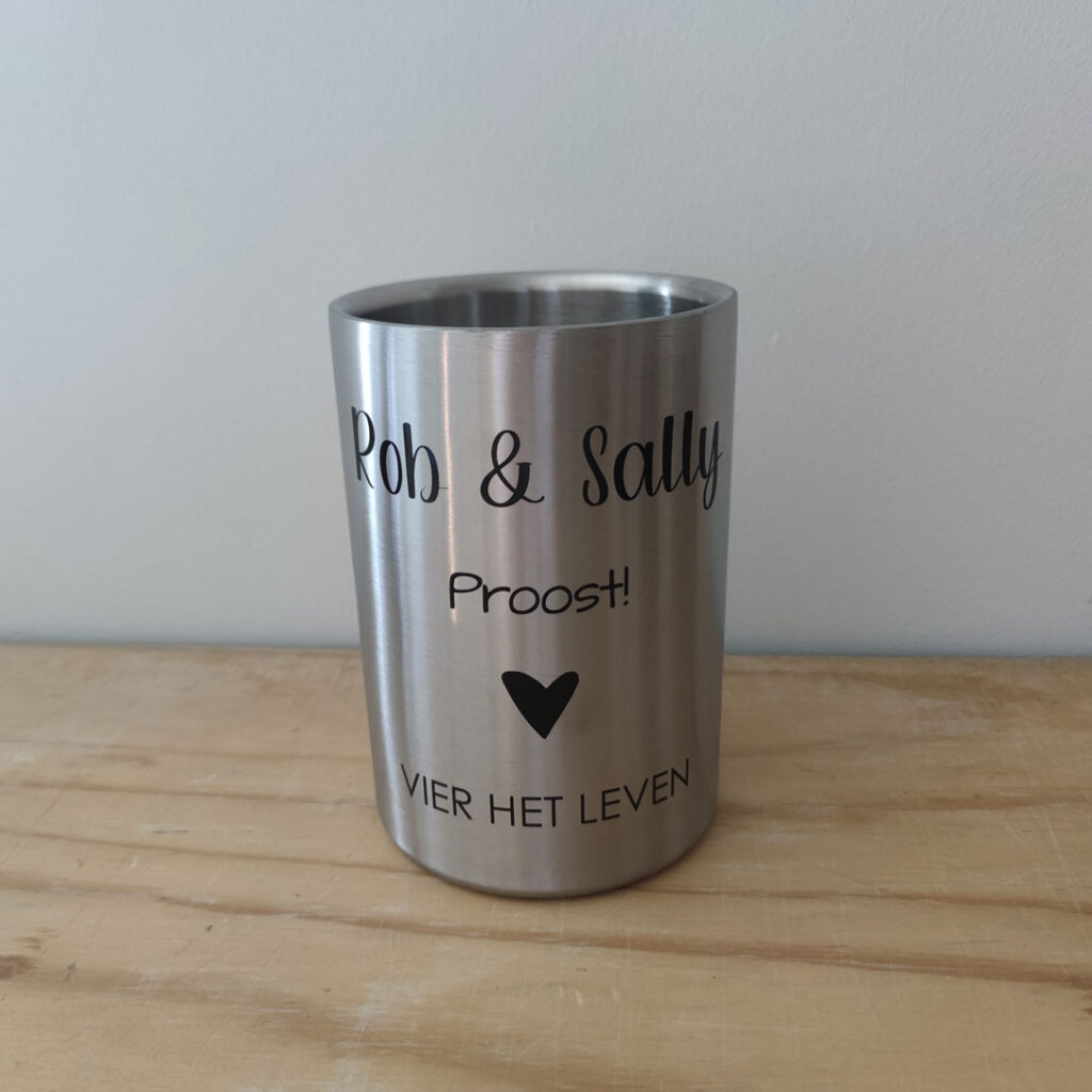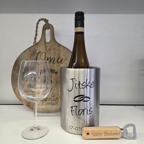Een stijlvolle wijnkoeler met naam of datum maakt elke feestelijke gelegenheid compleet. De gepersonaliseerde wijnkoelers zijn niet alleen functioneel, maar ook een echte blikvanger op tafel. Perfect voor bruiloften, jubilea of als luxe cadeau.